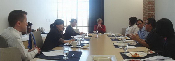 | 2010年11月1日中午12点到2点,天华学院赴美学习交流团与太平洋大学学生管理部门(Student Life Division)相关负责人见面座谈,太平洋大学负责学生事务的副校长伊丽莎白(vice president,Elizabeth Griego)和学生管理四个部门的负责人出席会议,与天华学院学习交流团队进行了友好深入的交谈,双方就新生入学教育,宿舍管理,与家长联系沟通方式,学生社团管理等方面交流了管理理念和做法。 | ||