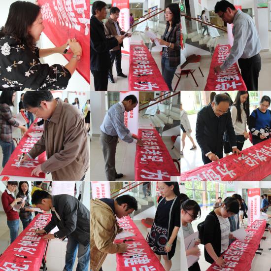 活动期间,教务处党支部的党员们向我校师生发放了印有我校“学习纪律条例”相关内容的活动单页。同时,他们还邀请了我校师生在印有活动主题的宣传横幅上签字。龚春蕾、陈新斌、杨良准、郭伟钧、陈道炯、符跃鸣、刘天翔、王一青等学校及部门领导和数百名师生在横幅上签下了名字!