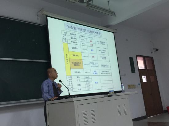 2015年11月5日,应我校语言文化学院的邀请,九州共立大学附属图书馆馆长松田高史教授、沙秀程教授莅临我校,为日语专业大二、大三的师生,作了题为“从茶道探究日本文化精髓”的学术讲座,讲座由日语专业主任丁玲玲主持。