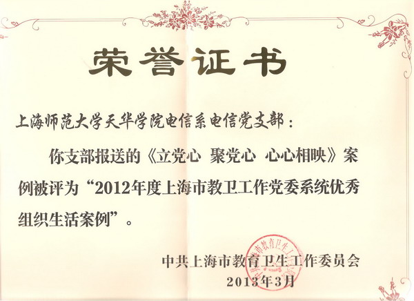 | 2013年3月27日下午,上海市教卫党委系统2012年度优秀组织生活案例交流表彰会在上海戏剧学院举行,我院电信系党支部选送的“立党心,聚党心,心心相映”案例在会上被评为优秀组织生活案例。电信系、计算机系联合党总支书记刘香连参加会议并上台领奖。 | ||