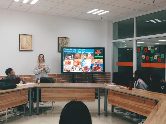 在这8次精彩生动的现场活动中, Bridget和Brian通过丰富的资料和风趣的演绎为参与学生们展示了与众不同的美国文化,参加的同学们学习到了很多平日里接触不到的语言和文化知识,提高了语言能力,同时也开阔了视野。每次英语角的活动主题贴近生活的方方面面,如:关于美国的名人介绍、饮食方面的文化差距,有利于日常表达的俗语使用,也有实用的西方社交礼仪和西方的传统节日介绍。另外,英语角额外增加了圣诞节专场。除了使参与学生了解节日的习俗和传统之外,大家还一起进行趣味游戏,深入了解圣诞节在西方文化的重要性。