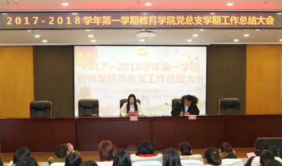 2017年12月28日下午16:30,教育学院2017—2018学年第一学期党总支工作总结大会在晖华楼报告厅顺利召开。此次大会由教育学院党总支副书记朱可老师主持。莅临本次会议的有教育学院党总支副书记何凯老师、教育学院分团委书记沈洁老师、学前教育专业第一支部书记康淼老师、学前教育专业第二支部书记杨荻老师、艺术教育专业第一支部书记叶双老师、艺术教育专业第二支部书记狄怨怨老师、小学教育专业党支部书记颜银树老师以及各位正副辅导员们。