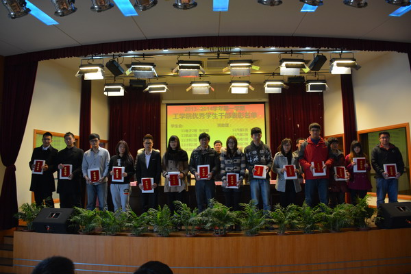 | 2014年3月5日工学院在五楼报告厅隆重举行优秀学生表彰大会,表彰上学期工学院学生会、党员工作站、学生自管会的优秀学生干部、班助理和志愿者以及在市级竞赛获奖的学生,促进学风建设,传递校园正能量。工学院院长吴国兴、院长助理徐振、范君艳、工学院党总支副书记王慧荣、赵科出席了会议,工学院全体辅导员及各班学生代表参加了会议。 | ||