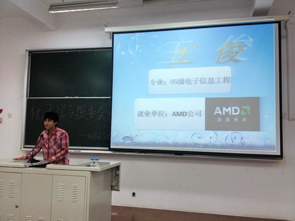 | 为响应学院学风建设活动的号召,2013年5月23日下午我院电信系特邀2005级电子信息王俊、2008级通信工程沈嘉尉以及2009级卜凡宇三位优秀学子,在日阶102举办优秀学子报告会。出席活动的有电信系团总支书记金玫,辅导员周欢,副辅导员彭刘刚及电信系2010-2012级学生。活动由金玫老师担任主持。 报告会主要由三位优秀学子分别从大学生活、就业方向及社会阅历等方面向在座同学进行交流。卜凡宇同学就大学期间如何学会树立目标,明确学风建设的重要性展开交流;沈嘉尉同学主要以一名商人的身份教会学生大学毕业后如何正确认识和看待“赢”的理念,明确就业方向;王俊同学以个人考研至从事专业有关的工作经验为同学们敲响了如何好好学习专业知识的警钟,分享了大学学习与就业心得,为我系学子更好地明确了未来就业方向并提出了宝贵意见,展现了他乐观进取的人生追求。报告会上优秀学子们的演讲使得在场同学们备受鼓舞。 (金玫) | ||