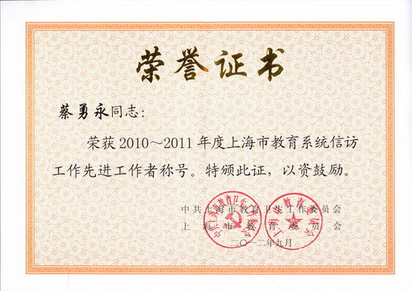 | 2012年10月11日下午,中共上海市教育卫生工作委员会、上海市教育委员会在交通大学医学院,召开2010-2011年度上海教育系统信访工作暨优秀信访工作者称号通报表彰会议。上海市教卫党委书记、市教委主任薛明扬等领导出席会议。我院蔡勇永同志荣获2010-2011年度上海市教育系统信访工作先进工作者称号。 | ||