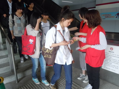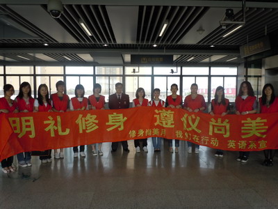 |                 4月29日下午,学院英语系14名志愿者赴嘉定西站参与了修身尚美、展天华学子风采公益活动,英语系团总支书记夏智源带队,旨在使明礼修身、尊仪尚美理念进一步深入人心。本次活动是英语系“修身尚美月”系列活动的一个重要组成部分。“修身尚美月”始于四月中旬,将于五月中旬告一段落,由四个系列活动组成:知礼、讲礼、善礼――固定场所中英文宣传;文明礼仪伴我行――书签大放送;修身尚美,展天华学子风采――嘉定西站公益活动;语音室、机房中英文贴士张贴及明华楼办公室中英文门牌前期准备工作。 活动期间,志愿者分成三组,分别在出入口派发英语系学生设计制作的明礼修身、尊仪尚美的书签、在自动扶梯口提醒乘客文明乘坐电梯及自觉遵守左行右立、在自动售票点为乘客提供帮助。 本次活动在地铁11号线嘉定西站站长和全体员工的配合下圆满地落下了帷幕。全体志愿者与嘉定西站站长合影,并赠予书签作为留念。(姚励琪)  |     ||