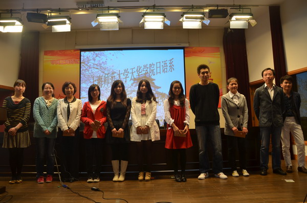 | 2012年10月29日晚,日语系师生齐聚明华楼五楼报告厅举办第八届日语演讲比赛。日语系常务副系主任吴素莲及日语系教师秦嘉、全中元、余颢和张丽�等担任评委。比赛的题目是《私の宝物》,经过激烈角逐,最终马嘉莉、黄�璇和王婷婷同学分别摘取了四年级组、三年级组和二年级组的冠军。 此次比赛共有来自日语系三个年级的16名同学参加,参赛选手进行了精心准备,带来了精彩的演讲,激发了学生的学习热情。演讲结束后,吴素莲主任向同学们介绍了赴日研修的相关情况,曾在日本龙谷大学进修的全中元老师介绍了该校的基本情况,分享了自己的所见所闻。(日语系) | ||