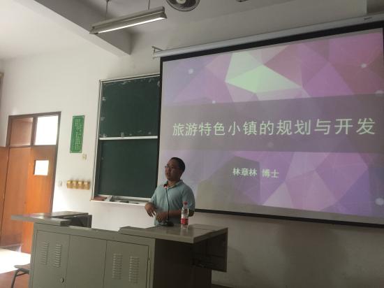 旅游小镇规划是林章林教授主要关注的热点规划项目之一,因此课堂主题定为“旅游特色小镇的规划与开发”。本次讲解主要从旅游特色小镇开发背景、缘起、特点、类型等几个方面展开,内容新颖独特,丰富饱满,让参与课堂听课的学生获益匪浅。同时,林章林教授在课堂最后阶段和学生进行了互动,就学生对于旅游规划的就业趋势以及学生未来个人规划、就业规划进行了悉心的指导和解答。