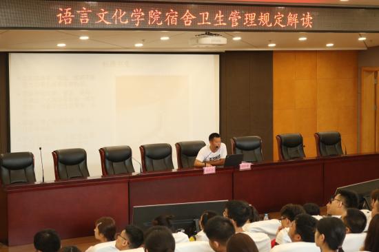 2018年9月18日下午,语言文化学院在辉华楼报告厅召开了宿舍卫生管理教育会议,语言文化学院党总支书记杨央、副书记刘庆奇,分团委书记张旭、英语专业支部书记顾加慧、德语专业支部书记曹占侠、辅导员沈美、叶杏雨等出席了会议,全体2018级新生参加了会议。会议由学院安全卫生工作指导老师胡世豪主讲。