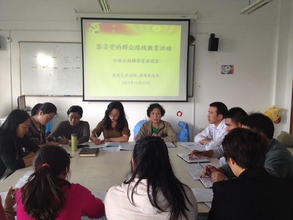 | 2013年10月15日14:30,教育艺术学院教育党总支在明华楼442手工教室召开落实党的群众路线教育活动正副辅导员座谈会。学校党委书记助理凌琦、教育党总支书记沈晓燕、总支副书记刘洪伟、艺教党支部副书记沈洁、小教党支部副书记颜银树、教育分团委书记朱可以及全体正副辅导员参加座谈。 本次座谈会由教育党总支书记沈晓燕老师主持。沈晓燕老师首先通报了10月14日晚男生寝室断网起哄事件,要求每个班级辅导员召开班会做好解释工作,并要继续密切关注、关心学生。随后,副辅导员对于开学以来的工作进行了总结,提出了工作中遇到的问题,包括学生队伍的梳理、学生宿舍卫生的检查规则、正副辅导员之间的联系等等。大家各抒己见,开展批评与自我批评,讨论的气氛非常热烈。最后,凌琦老师进行总结,要求所有的正副辅导员做事一定要讲究民主,做到为人师表,做个有心人,要做好对学生的暖心工作。(沈洁) | ||