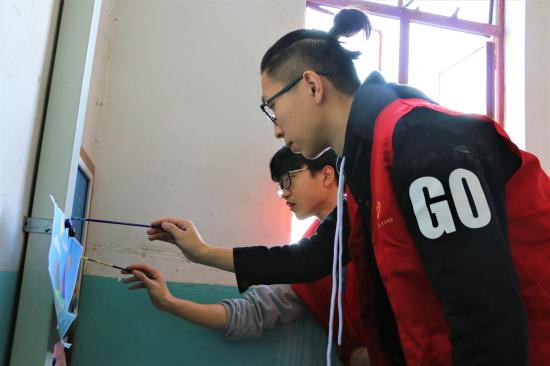 在详细分工后,四组成员便开始绘制墙面,一切都显得井然有序,没有一丝慌乱。同学们都顶着高度集中的精神进行绘画,小心翼翼地勾勒每条线,每一笔线都是经过精心思索。