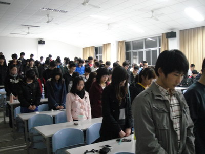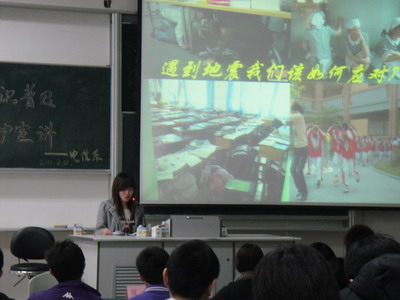 |                 2011年3月31日,电信系在日华楼402举办了自然灾害知识普及与自我保护宣讲大会。2010级辅导员周丽婕、夏超,团总支副书记金玫,学生会主席许云峰和2010级各班班助理出席本次宣讲会。 会议从2011年的日本大地震相关报道展开,详细介绍了有关地震的知识及其危害和影响,并播放了相关防震视频。随后,对日本地震引发的核泄漏进行了一系列解说,并由各班代表介绍如何应对核辐射和防辐射的措施。 大会最后,全体起立为遇难者默哀三分钟,以悼念地震中的逝者。(王雪影)  |     ||