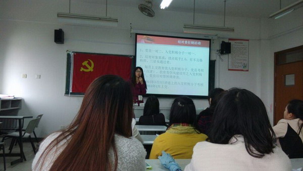 | 2014年3月28日中午11点半学前教育专业党支部、艺术教育专业党支部和小学教育专业党支部分别在日阶101、日阶103和月411召开了结对责任制工作推进会,会议分别由学前教育党支部书记康淼、艺术教育专业党支部副书记沈洁、小学教育专业党支部书记韩苏曼主持,支部所有党员、积极分子参加了会议。 会议对2012-2013学年评为优秀结对帮困先进个人的学生进行了表扬,确定了本次党员和入党积极分子的结对工作,明确了对于党员、积极分子的考核制度,以期在今后的工作中更好地树立党员的模范带头作用。(沈洁) | ||