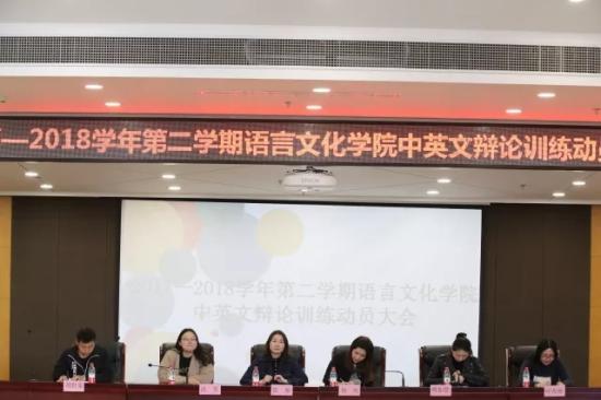3月28日,为更好地推进中英文辩论训练工作,语言文化学院党总支在晖华楼报告厅召开了2017-2018学年第二学期中英文辩论训练动员大会,语言文化学院党总支副书记杨央、分团委书记张旭、英语专业支部书记顾加慧、各专业辅导员以及各班辩论小组组长、主席参加会议。