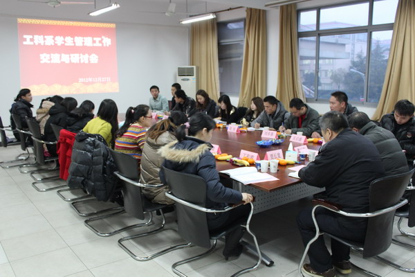 | 2012年12月27日下午,电信系牵头,携计算机、机械系在月华楼270召开工科系学生管理工作交流研讨会。学保处处长曹云林,监察委督学贾长宽,学保处副处长刘天翔,学保处处长助理周建文,电信、计算机系联合党总支书记刘香连,联合党总支副书记王慧荣、刘卓基,机械系党总支副书记丁彩霞以及工科系全体正副辅导员出席会议。电信系通信工程党支部副书记吴启源主持。 | ||