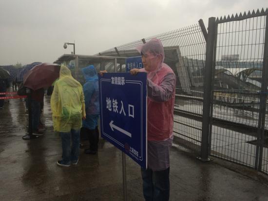 16日赛事期间从早晨开始普降大雨,尤其是赛事结束散场期间,雨量逐渐增大,志愿者们冒着狂风暴雨,依然坚守在自己岗位上,诚心竭力服务每一位乘客。