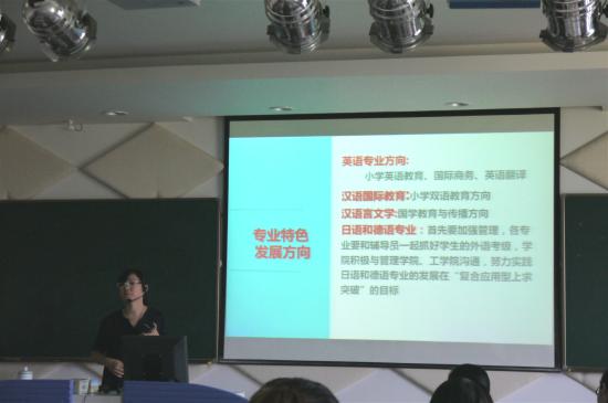 常务副院长陈再阳根据学校董事会新学年的工作纲要,结合语言文化学院发展情况和特点,提出了新学年学院工作的指导思想,部署了各阶段的工作重点。她要求学院各专业紧扣“多科性应用技术型民办高校”的学校定位,坚持“专、通、雅”协调发展的人才培养模式和“四个天华”的办学理念,围绕“强化国际办学、打造活力课堂、发展特色专业”三大任务,在做好日常教学和管理的基础上,以“弘国学、重实践、师范性特点明显、突出学生的口头和书面表达能力”为旨归,从明确专业特色发展方向、加强国学教学凸显语院品牌、学生培养“应用型上显成效”、聚焦课堂教学改革、注重教学科研成果积累、狠抓质量迎接评估等方面阐述了本学期的工作重点。