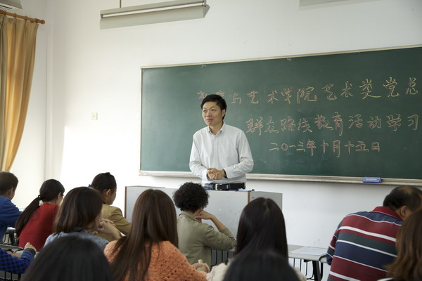 | 2013年10月15日下午,我校教育与艺术学院艺术党总支在日华楼370召开群众路线教育活动学习会暨民主生活会。校党委书记助理凌琦、艺术党总支书记、学保处副处长刘天翔,党总支副书记李根胜、沈思,支部正副书记王一青、孙伟、徐姗姗、纪怀晨参加会议。会议由艺术党总支副书记沈思主持。 大会开始,首先宣读党总支委员会组织机构及总支委员职责分工。紧接着党总支书记刘天翔老师组织全体党员进行专题学习。他强调党员一定要认真学习、深刻领会实践群众路线活动的精神,开展深刻的批评与自我批评,要严格要求自己。会上,教师党员纪怀晨与学生党员杜玉婷作为代表进行交流发言。会议最后,党委书记助理凌琦讲话,指出我们一定要将理论联系实际,提高党员标准,勇于向前,要求所有党员从思想上真正入党,并带动身边群众,发挥“一个党员一面旗”的作用,为学校的建设作出贡献。 学习会结束后,全体党员以支部为单位就落实群众路线方针召开组织生活会,开展批评与自我批评,提出改进的措施和办法,并在会后提交书面学习心得。同时,各支部谋划开展党员服务群众的实施方案。 | ||
