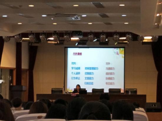 张老师首先介绍了语言文化学院分团委、学生会组织架构,学生会各部门职责及特色队伍,并重点介绍了语言文化学院品牌活动以及本学期重点活动安排。在回答为什么要加入学生会这个问题时,张老师结合个人成长经历,与学生分享了自己的学习生活经验,并告诉大家,所有的汗水都不会白流,曾经付出的努力或许没有给予眼前的荣誉或成绩,但在将来会给你带来意想不到的收获。