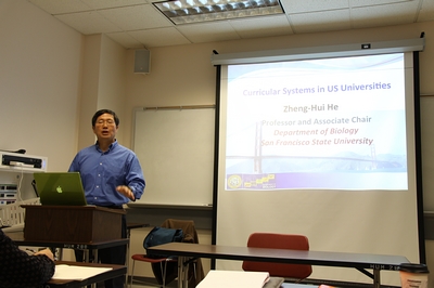 | 8月9日上午,旧金山州立大学生物系副主任贺正辉教授为我院第三批干部研修团作专题讲座。他从东西方对“好学生”的不同理解入手,以生动的实例,相继介绍了美国的教育理念、旧金山州立大学的教学评估、旧金山州立大学人事制度中的教师招聘、留用、升迁和教授终身制等方面内容。(第三批干部赴美研修团) | ||