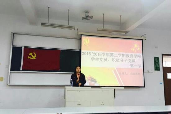 2016年4月5日下午,教育学院党总支在日阶302开展学习型党组织第二课堂建设活动,教育学院全体党员、预备党员和入党积极分子参加了此次活动。教育学院党总支组织委员、小学教育专业支部书记沈洁作为本次学习型党组织第二课堂的第一位特邀主讲教师,为在座的学生党员、积极分子作了 “完善党的制度,提高党性修养”的专题讲座。