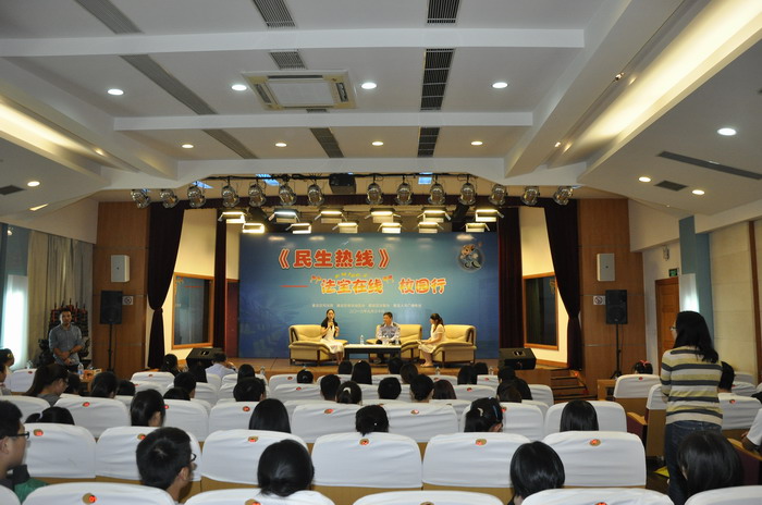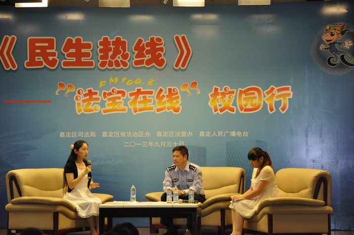 2013年9月30日上午10点至11点,嘉定人民广播电台《民生热线》――“法宝在线”校园行节目在我校明华楼报告厅进行现场直播,为现场学生上一堂特殊的法制教育课。