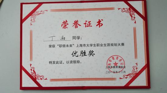 我校职业生涯教研团队在陈英慧老师的带领下,积极动员学生参赛。张璐老师组织赛前培训,对参赛的数十名选手精心指导,对参赛作品反复修改,经过层层筛选,最终推选出4名学生的作品代表我校参加市级比赛。15学前教育4班的丁雨同学终于不负众望,入围复赛,荣获了“职领未来——上海市大学生职业生涯规划大赛”优胜奖。