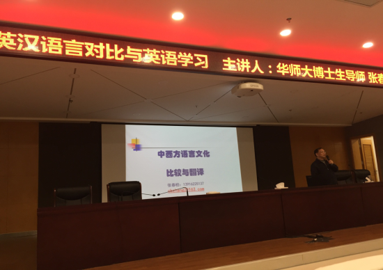 在讲座中,张教授介绍了英汉对比研究的重要性和英汉语差异的思想、文化根源,并从词汇层面、句子和语篇层面深入浅出地阐述了英汉语差异的具体表现。张教授结合自己从事多年的翻译教学、工作和研究经历,引用了大量实例,阐述其在英汉对比研究和翻译领域的睿智见解。同时,还不时穿插着文化标识,介绍文化知识和翻译方法。整场讲座旁征博引,思路清晰,内容充实生动,在展示语言魅力的同时,也彰显了张春柏教授深厚的学术造诣,对在场学生今后的英汉语学习,尤其是英汉语翻译的学习和实践有很大的启发作用。在场教师也纷纷表示受益匪浅。