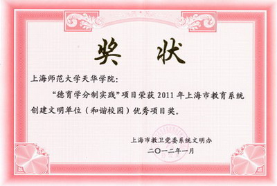 | 据《关于表彰2011年上海教育系统文明单位(和谐校园)创建优秀项目的通知》,我院《实施德育学分,创新育人模式――“德育学分制”实践》项目荣获2011年上海市教育系统创建文明单位(和谐校园)优秀项目奖。2012年3月13日,市教卫党委系统文明办在市科教党校对获奖单位进行了表彰,并颁发了证书。 | ||