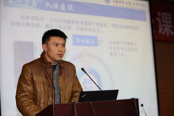 | 2013年12月21日,由上海市教委学生军训工作办公室、上海市警备区学生军训工作办公室联合组织的“上海市普通高等学校军事教师授课竞赛与教学研讨会”在上海市人武学校举行。上海市教委体卫处黄峰、上海市人武学校校长楼陆建校长、上海市警备区领导及各高校专兼职军事教师参加本次会议,会议由上海市学校国防教育协会秘书长张国清主持。研讨交流阶段,同济大学、交通大学、财经大学代表公办大学交流发言,我校是唯一一所代表民办大学发言的学校。通过曹云林处长的精心指导,学保处国防军训科科长刘庆奇会前进行了大量的准备工作,包括拍摄视频、制作PPT。会上对我校军训队伍建设及军训开展情况进行了介绍,得到市教委、警备区领导的高度肯定,各兄弟院校也给予一致赞扬。 | ||