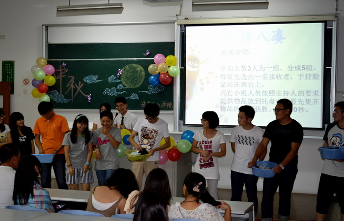 | 2013年9月19日晚上18点,语言文化学院“我们在你身边”中秋主题晚会在日阶201顺利举行。该活动由语言文化学院分团委学生会及班助理工作团队联合主办。语言文化学院汉语国际教育专业党支部副书记曹占侠、班助理团队指导教师虞琪君出席。 本次活动的节目丰富多彩,高潮迭起。主持人与表演人员都是来自13级语言文化学院各专业的新生,或激情洋溢地诠释了舞蹈映山红的魅力,或将在场老师与现场同学带入了或柔情缱绻或激昂慷慨的歌曲意境中。其中,在“七拼八凑”等游戏环节,不同专业的新生随机成组,更是激起了大家的热情,将气氛推向了高潮!晚会最后,虞老师以切身经历分享了在天华圆梦的成长路,用自身的努力激励在座新生寻梦天华。 独在异乡为异客,每逢佳节倍思亲。此次活动旨在为独自在外省过节的新生缓解思乡之情,建立以天华为家的信念,增进新生间的交流,打破专业间的隔阂。本次活动共有来自安徽、四川、贵州、黑龙江等近百名学生参加,13级各班班助为新生填写中秋心意卡片,并为师生准备了月饼、糖。整场晚会联欢娱乐之余,也传承了传统中秋文化。(语言文化学院) | ||