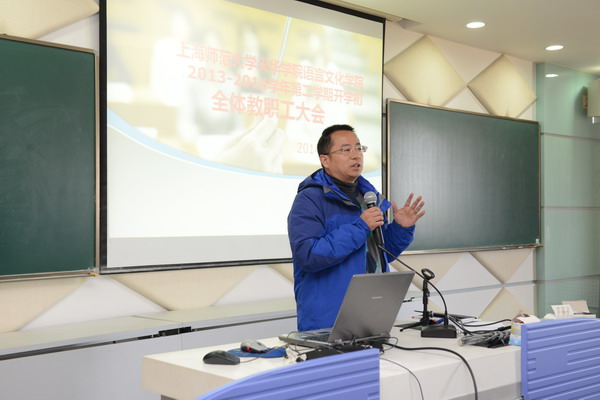 副院长陈再阳作《语言文化学院2013-2014学期第二学期教学工作重点》报告,详细解读了本学期语言文化学院的教学工作指导思想和工作思路,就如何进一步规范教学秩序、建立现代教学管理体系、迎接专业评估、如何做好完善专业和学科发展规划、教师骨干与科研团队的建设和提升、2014届学生的毕业工作和如何全力做好第26届韩素英翻译大赛的承办工作、教育国际化等方面进行了工作部署,号召全体教职工统一思想、齐心协力将工作着力点集中到提高教育质量上来,真正让学生受益。