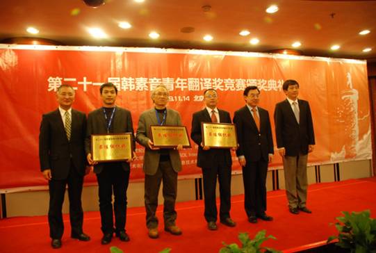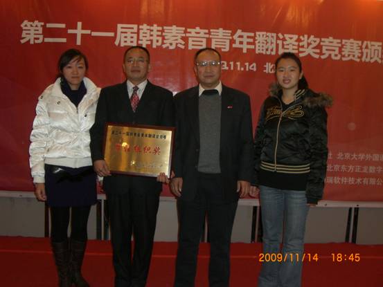 | 我院院长助理、英语系常务副主任史文博士和指导教授万正方等赴北京大学,参加了第二十一届韩素音青年翻译奖大赛颁奖典礼,捧回10个奖杯,其中8个英译汉奖、1个汉译英奖、1个优秀组织奖。 韩素音青年翻译奖大赛是我国翻译界举办历史最悠久、水平最高、最具权威性的翻译大赛。天华学院所取得的这一骄人成绩,在全国高校和外语界引起了很好反响,赢得了不少同行赞叹和祝贺。 | ||
