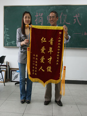 | 5月18日 中午,艺术系于明华楼452举行了简短的“传承志愿精神,点燃希望之灯”捐赠仪式。 07级艺术设计3班郭敏杰同学向嘉定区明天小学捐赠2000支圆珠笔,以表示对民工子弟小学教育的关心和支持。明天小学20余名师生代表接受捐赠。 艺术系常务副主任吴明道出席仪式并讲话,希望艺术系能与明天小学成为长期合作的定点单位,既让能大学生进一步锻炼社会实践能力,也能让明天小学的学生感受到社会的温暖。 会后,明天小学师生代表参观了艺术系2010届毕业作品展和各类实验室。(王一青) | ||