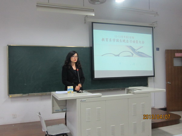 | 2013年4月8日晚,教育系第二期学困生晚自习动员大会在月华楼151召开,教育系、心理系联合党总支书记沈晓燕,总支副书记韩苏曼,学前教育与小学教育专业学生联合党支部副书记尤琼,教育系全体辅导员及40位学困生与77位督导生参加会议。会议由主管学困生晚自习的尤琼老师主持。 为提高大学二年级、三年级学业特别困难学生学习成绩,教育系自上学期开始开展了学困生晚自习活动。教育系从全系2010、2011级学生中筛选出学业特别困难的一批学生,由党员、入党积极分子作为督导生,每周一至周四晚在固定教室,督导学困生进行晚自习。 此次动员大会针对学困生和督导员,提出了不同要求。沈晓燕老师明确提出,晚自习督导是预备党员转正、发展积极分子的重要考核项目之一,党员及积极分子要发挥模范带头作用,督促身边的同学。而学困生则要要向身边的同志学习。同时,希望全体学生都能珍惜晚自习的时间,切实提高自己的成绩。动员大会结束之后,第二期学困生晚自习正式开始。(教育系) | ||
