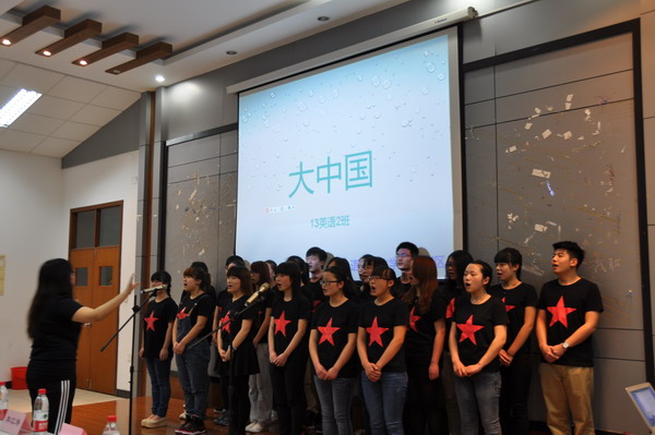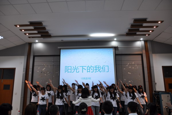 | 2014年3月24日晚7:30分,语言文化学院在日阶401举行了合唱比赛,语言文化学院党总支书记孙叶青、副书记周建文、蔡勇永,分团委书记杨央老师以及各专业负责人担任评委。语言文化学院13级的8个班级参加了本次比赛。经过激烈角逐,13英语3班以《阳光下的我们》勇夺冠军,13汉语国际教育1班凭借《南泥湾》夺得亚军,13德语1班以《我相信》获得第三名。(语言文化学院) | ||