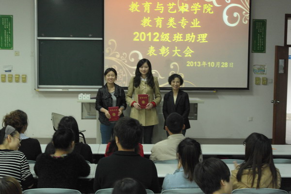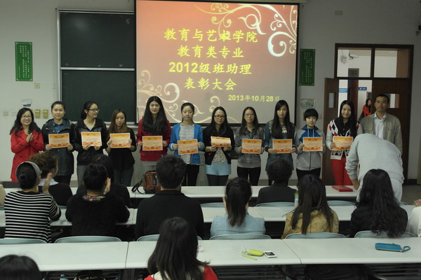 | 2013年10月28日16:30,教育专业党总支举行2012级优秀优良班助理表彰大会,学校党委书记助理凌琦、教育类专业党总支书记沈晓燕、党总支副书记刘洪伟,艺术教育专业学生党支部书记吴启源、党支部副书记沈洁以及辅导员老师们参加大会。 会议向教育与艺术学院教育专业2012-2013年度“优秀、优良班助理”颁发了荣誉证书。党委书记助理凌琦发表讲话,对班助理付出的努力表示赞扬与肯定,希望班助理们继续努力,鼓励老师和班助理们能够齐心协力,共创新生工作的良好风貌。12级班助理代表房晴川和13级新生班助理代表陆凯文交流发言。 | ||