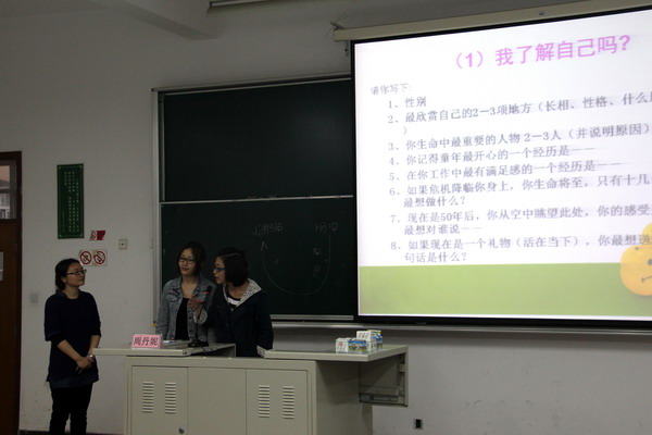 | 2014年 4月17日,学保处在日华楼阶梯教室102举行班助理团体辅导沙龙。13级全体班助理、13级新生各班班长、心理委员出席了此次活动。学校班助理负责人华芸老师主持。 教育与艺术学院教育类专业辅导员、心理学专业研究生周丹妮老师做了“大学生素质拓展”专题讲座――“团体辅导的理论与操作”。周老师介绍了团体辅导的主要理论以及团体发展过程,又详细地讲解了团体辅导方案要素、活动流程,并从“捉蜻蜓”暖身活动开始,通过组织大家参与“我了解自己吗”的活动,建议同学们加强与身边的同学沟通交流,从而更加深刻地认识自我与他人。此外,她还介绍了“生存选择”、“爱在指尖”、“搭宝塔”等团体活动,引导大学生理解不同价值观,懂得人际交往的方法、领悟团体合作精神的重要性。 会议最后,华老师希望班助理要引领大一新生积极开展形式多样的素质拓展活动,如时间管理、学会学习、恋爱情感、情绪管理、生命教育等主题活动,促进大学生心理健康,增强班级凝聚力,创建和谐校园。(学保处) | ||