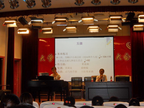 | 2013年5月21日下午,教育系在明华楼五楼报告厅举办了上海音乐学院钢琴四、五级考级指导讲座。此次讲座由钢琴老师田剑玫、朱小�主讲。 田剑玫老师首先介绍了上海音乐学院钢琴考级的特点,随后详细介绍了四级曲目需要注意的地方,包括指出了容易出错的点和细节,比如情感的把握、节奏与轻重的掌控、还有识谱中会遇到的一些问题。田老师亲自在钢琴上弹奏了每一首曲子,给同学们以最标准的示范。朱小�老师特别邀请她的一名学生来示范五级曲目,并深入浅出地讲解了曲目中的一些难点与重点,让同学们能更快更容易地掌握要领。两位老师的考级指导各有特色,但都细致入微、详细严谨。台下的同学们也都认真聆听,并不时拿出自己的考级书做笔记,及时发现和改正自己平时练习中的不足出错之处。通过指导,同学们收获颇丰,在提高了专业技能的同时,也进一步增强对钢琴演奏的兴趣。(教育系通讯员:吴晏婉) | ||