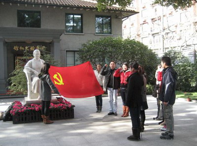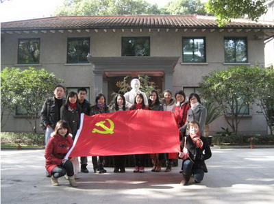 | 2009年12月26日,英语系学生党支部全体党员党员在支部书记孙超、副书记周建文带领下,瞻仰参观了宋庆龄故居,全体党员面对党旗庄严宣誓。(孙超) | ||