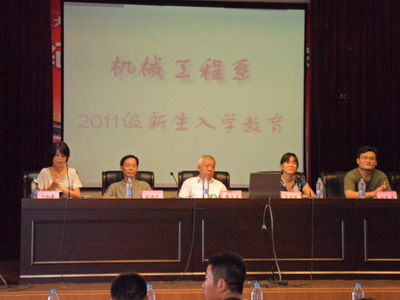 | 9月17日下午,机械工程系在明华楼五楼报告厅召开2011级新生入学教育大会,机械工程系主任徐宝富教授,常务副系主任张洪兴教授,主任助理刘建房、范君艳老师,及专业负责人和新生正副辅导员等14人出席了本次大会,会议由机械工程系学生党支部书记丁彩霞老师主持。 会上,机械工程系主任助理范君艳老师向2011级新生们详细介绍了机械工程系概况、师资力量、教学成果和学生就业情况,并且就如何快速适应大学生活、如何度过有意义的四年大学生活与学生们进行了深入探讨。机械工程系常务副系主任张洪兴老师对新生的到来表示热烈欢迎,他详细介绍了机械工程系的优势所在,向新生们提出两点期望:潜心学习、少打游戏。 会后,机械、汽服和机电三个专业的新生在系专业负责人的带领下进行了分专业教育和实习基地的参观。(机械工程系) | ||