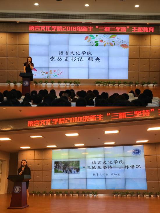 2018年9月19日上午9时,语言文化学院在辉华楼小剧场召开了2018级新生“三抓三坚持”主题教育大会。学院党总支书记杨央,英语专业党支部书记顾加慧,新生正副辅导员胡世豪、胥德青、叶杏雨出席会议。会议由语言文化学院分团委书记张旭主持。