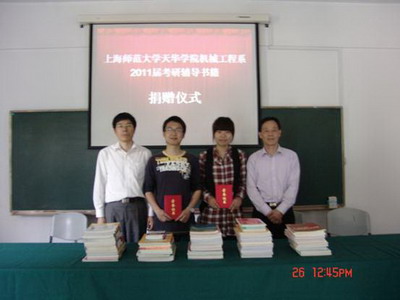 5月26日,机械工程系举行2011届考研书籍捐赠仪式。机械工程系强海燕、陶镛光代表2007级考取硕士研究生的8名同学,母校图书馆捐赠考研书籍87本。学院图书馆馆长吴国兴、机械工程系常务副主任张洪兴出席。(林颖)