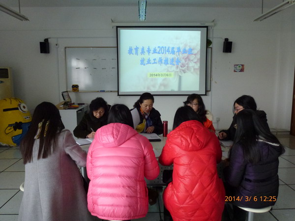 | 为了指导就业工作的顺利开展,教育与艺术学院于2014年3月6日在明华楼442手工教室召开了教育类专业2014届毕业班就业工作推进会。出席会议的有常务副院长滕薇、党委书记助理凌琦及全体10级毕业班辅导员,教育类党总支书记沈晓燕主持了本次会议。 在会议中,滕老师首先听取了各毕业班辅导员所做的简短介绍,包括各班的学业情况、目前实习就业情况和就业工作中的困难等,接着,她对毕业班辅导员的工作提出了三点要求:一是加强毕业生离校前的教育与引导工作,耐心解决毕业生所遇到的实际问题;二是做好毕业生信息的统计和跟踪工作,为今后的就业指导工作提供依据;三是维持毕业生离校前的校园稳定工作,劝导毕业生要有理有度有节,为学弟学妹们树立文明离校的榜样。 | ||