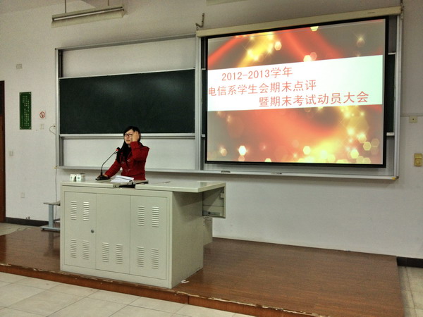 | 2012年12月20日晚,电信系学生会在日阶201召开“学生会期末工作点评暨期末考试动员大会”。电信系团总支书记金玫老师及第六届学生会全体委员共计85人出席会议。 金玫老师对系学生会所有委员的辛勤付出表示感谢,并回顾了本学期组织开展的诸如迎新志愿者服务、“青春•色彩”迎新晚会、“迎新杯”篮球赛、庆“十一”送温暖、“固纬杯”技能嘉年华系列比赛等近20个活动,向活动过程中表现优秀的先进个人和14位作出突出贡献的组织者授予了荣誉证书。会议最后,金玫老师对即将到来的期末考试进行了动员。(电信系) | ||