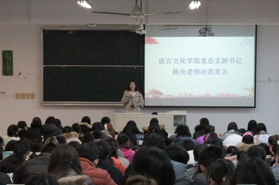 2017年12月11日晚19:30, 语言文化学院党总支2017-2018学年第一学期初级党课培训在日华楼阶梯教室302开班。党总支副书记杨央、分团委书记张旭、英语专业支部书记顾加慧出席,2016、2017级学生250余人参加了培训。