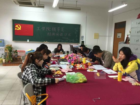 2015年11月16日,工学院本学期第四次辅导员经典阅读沙龙在明华楼351召开。学院党总支书记刘香连、副书记赵科、金玫,以及各专业支部书记、正副辅导员出席活动。