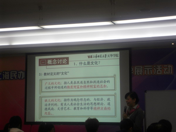 | 2012年11月3日,我院思政教研部部分教师在孙叶青主任带领下,赴上海杉达学院参加上海民办高校思政课“精彩一刻”教学展示活动,包括我院孙叶青在内的6所民办高校思政课教师模拟课堂教学,分别结合政治、经济、哲学、文化等内容作了精彩讲授,并与学生现场互动。 | ||