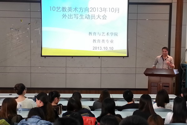 | 2013年10月10日下午,教育与艺术学院10级艺教美术方向外出写生动员大会在日华楼日阶401举行,教育与艺术学院副院长徐娟老师,学校党委书记助理凌琦老师,艺术教育党支部书记吴启源老师,艺术教育专业负责人杨莹老师以及艺术教育曹勇老师出席大会。2010级艺教专业美术方向参加写生的42位学生参加动员。 动员会上,副院长徐娟老师为大家讲述了此次活动的来之不易,并再三叮嘱、要求学生在外出写生活动期间注意人身安全。曹勇老师介绍了此次写生的目的地河南林州石板岩(原名太行山写生基地)的基本情况。杨莹老师则特别强调外出写生注意事项,如画具携带、用具配备等。最后,负责此次写生安全保障的吴启源老师强调了外出写生的安全以及组织纪律要求,希望大家在专业技能训练的同时,也要注意自己和集体的安全。 经过此次动员大会,2010级艺教专业美术方向的同学都对此次写生的目的和要求都有了明确的认识,也对安全问题高度重视。相信经过10天的写生训练,同学们的专业技能将有更进一步的提升。 | ||