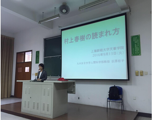 2016年9月13日上午,九州女子大学教授荻原桂子来我校做题为《如何解读村上春树》的学术讲座,陪同来访的还有九州共立大学校长助理沙秀程教授。日语专业主任张晓和专业教师丁玲玲、张丽珺、黄象汝以及日语专业13级、14级的全体学生一同聆听了讲座。
